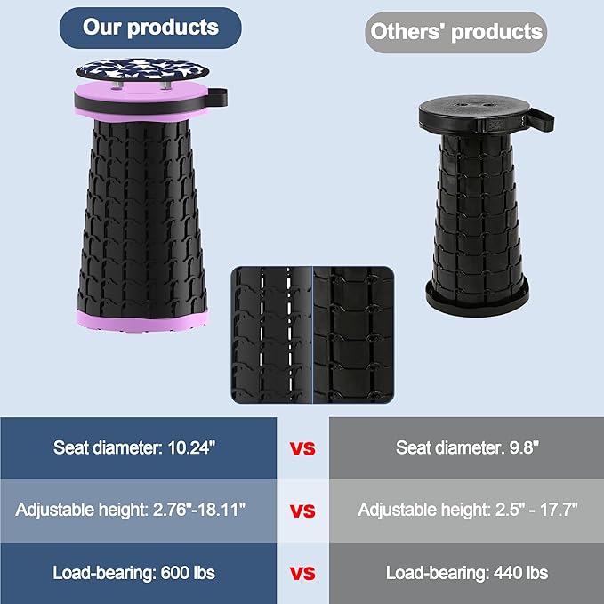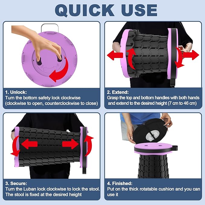 • 【2025 New Upgraded Folding Stool】Our redesigned, U.S. patented Portable Collapsible Stool Telescopic Seat Camping Chair more securely than previous versions and is made from durable, heavy-duty, recyclable high-molecular-weight polypropylene for a safer, more solid seating experience.