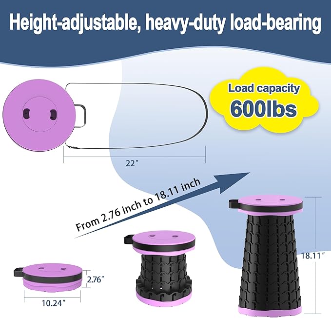 • 【Wider, Taller, Load-Bearing Capacity: 600 Lbs】This new generation of ALEVMOOM collapsible stool is larger than the old version, 18.11 inches high and 10.24 inches wide. Its load-bearing capacity has been greatly improved. After multiple tests, the load-bearing capacity is up to 600 lbs, which is 1.5 times that of similar collapsible stool, solving the problem of portable folding stools being easily broken.