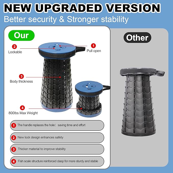 • NEWLY UPGRADED- Handle design on the bottom of the collapsible stools for adults has replaced the original design of fingers pulling away. It's easier to pull open