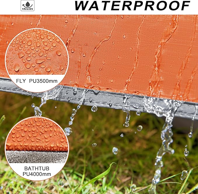 • Waterproof Tent:With a PU 3500mm rainfly and poly oxford 300D 4000mm water resistance on the bathtub floor, backpacking tent offers excellent waterproof performance to meet any condition. Seam taping on the zipper, velcro wrap with PVC & seam taping, and 4 bottom corners with seam taping provide added protection against rain and moisture. Plus, 3 person tent meets CPA1-84 fire retardant standard and UPF 46+ for enhanced safety.