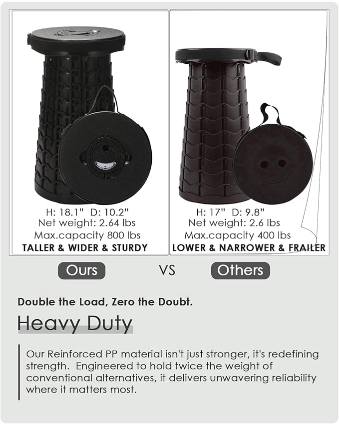 • 800 LBS HEAVY-DUTY CAMPING STOOL – Reinforced PP material, delivers double the industry strength, creating ultra-safe portable stools for adults of most sizes.